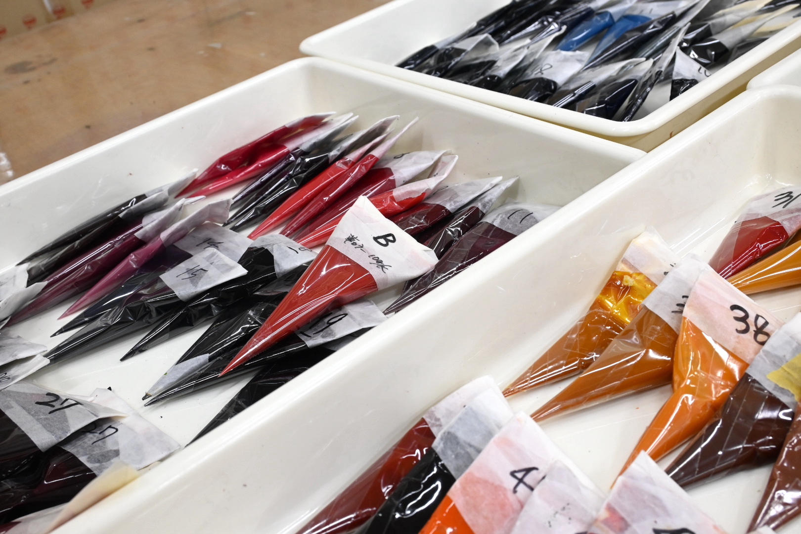 03 筒を作る 絵柄は、専用の筒に糊を入れて絞り出しながら描いていきます。伝統的に使われているのは「渋筒」と呼ばれる、渋紙(柿渋で補強した和紙)を円錐状にしたものです。先端に口金を入れることで、繊細な線を一定の太さで描くことが可能になります。私の場合は、色数も多く、力の入れ加減で線の強弱を描き分けるため、ポリプロピレンのフィルムで小さい筒をたくさん作り、各色ごとに準備しています。
