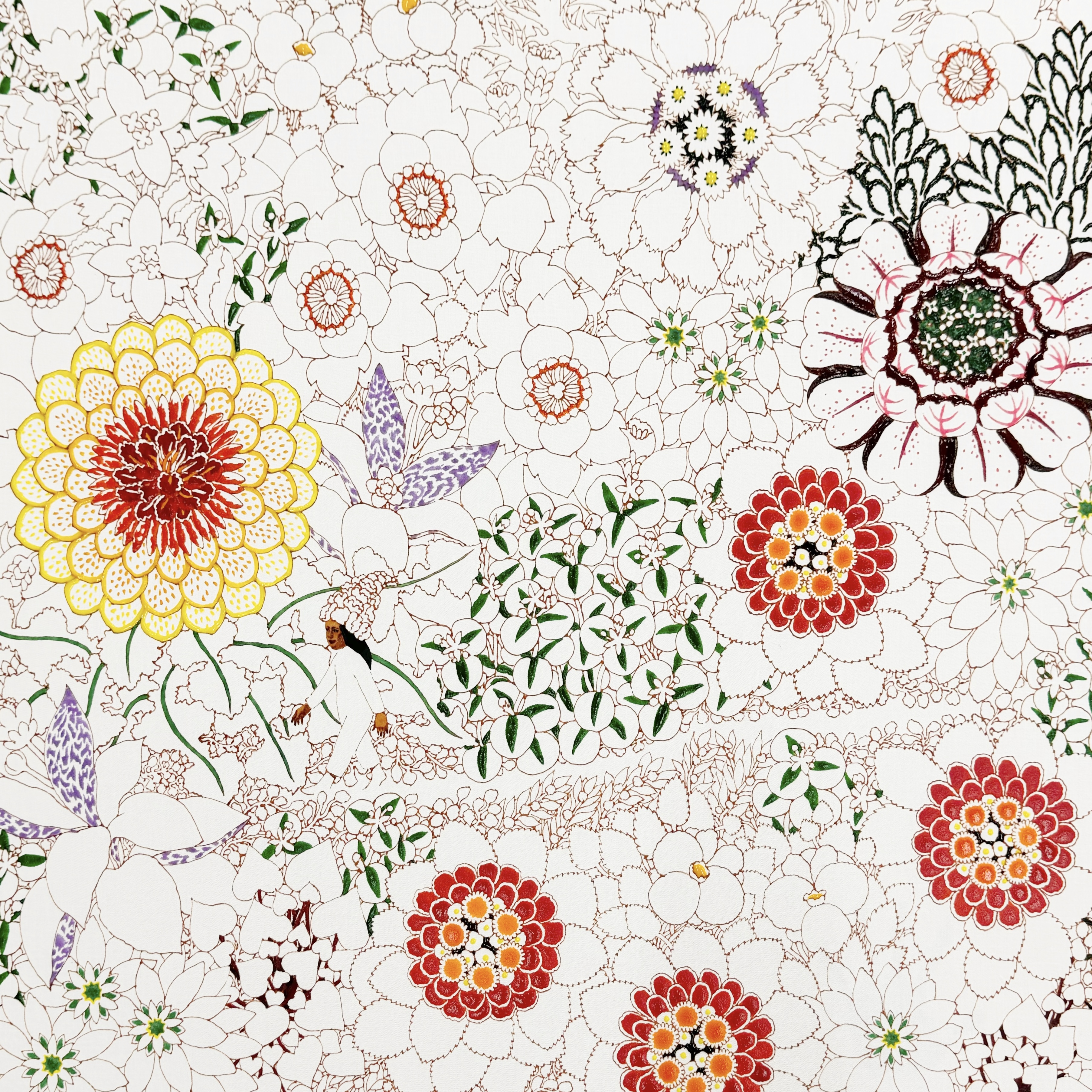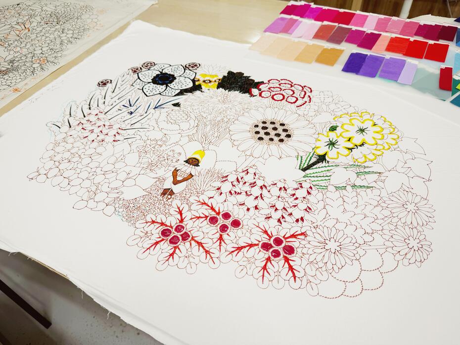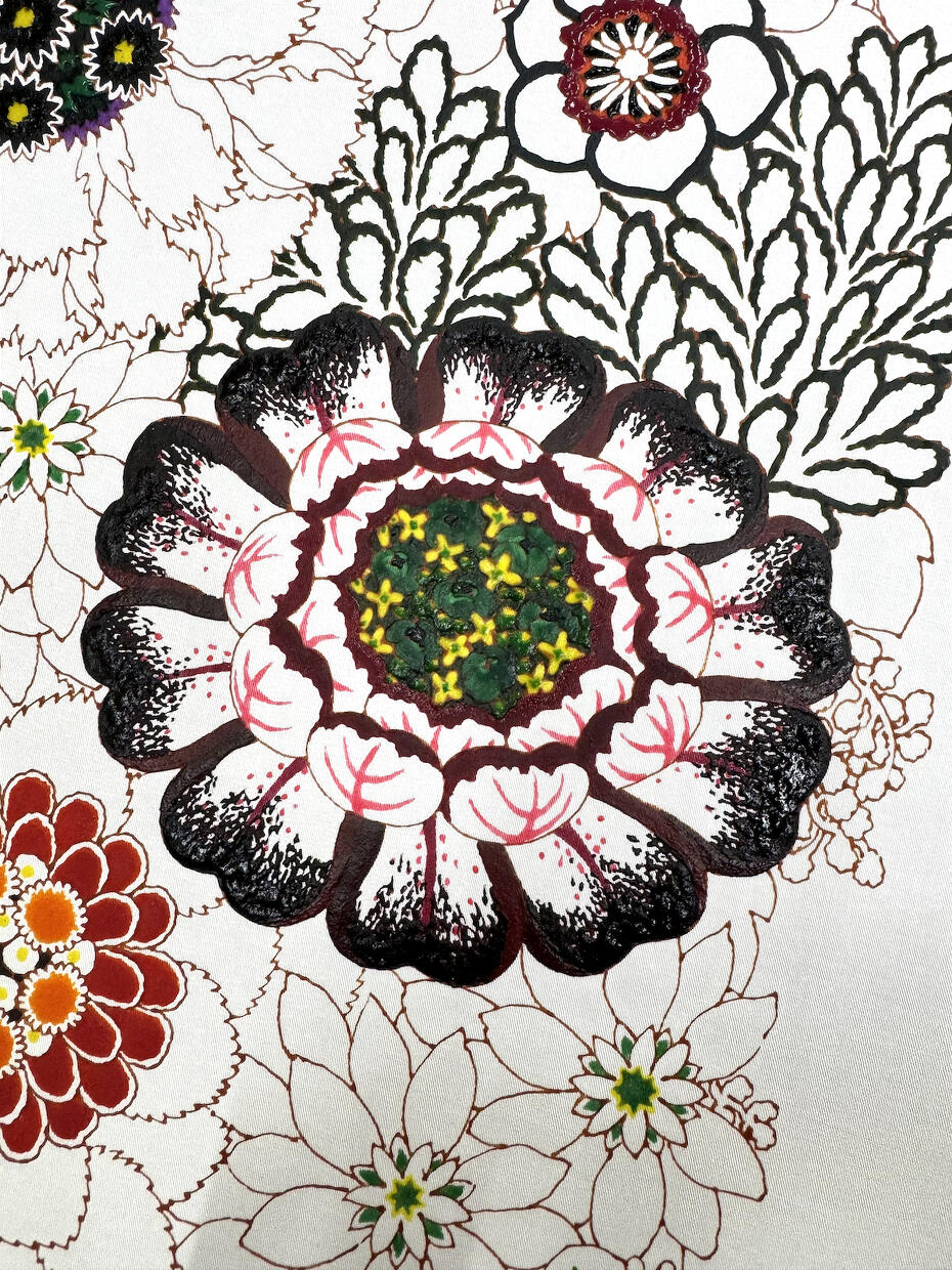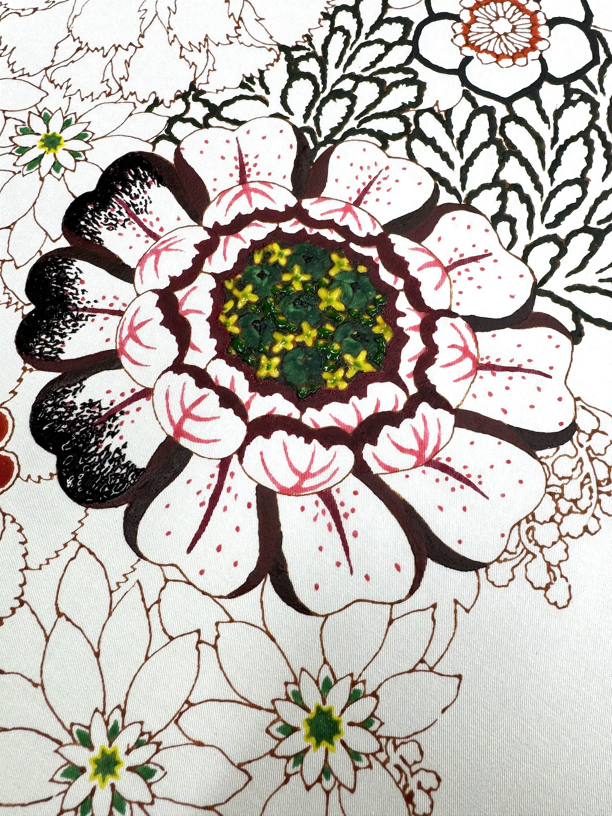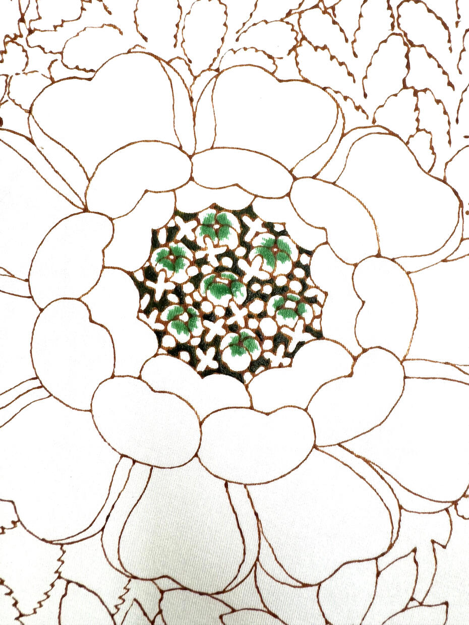一番楽しい作業です。糊が載った部分は繊維に蓋をした状態になります。そのため、上から新たに別の色が被さっても、先に糊が置かれていた部分には浸透しません。また、糊は最後に洗い落とします。色のついてない糊を置いたところはそのまま布地の色が残り、色糊を置いたところはその色だけが浸透します。この性質を利用して、なるべく一番細かいところから始めていきます。最終的には初めに描き込んだ部分は覆われてほとんど見えなくなりますが、上にいくら別の色糊が載っていても下の糊には影響はないので、糊を落とすと、最初に描いた模様が一番手前に現れるように染め分けができています。
